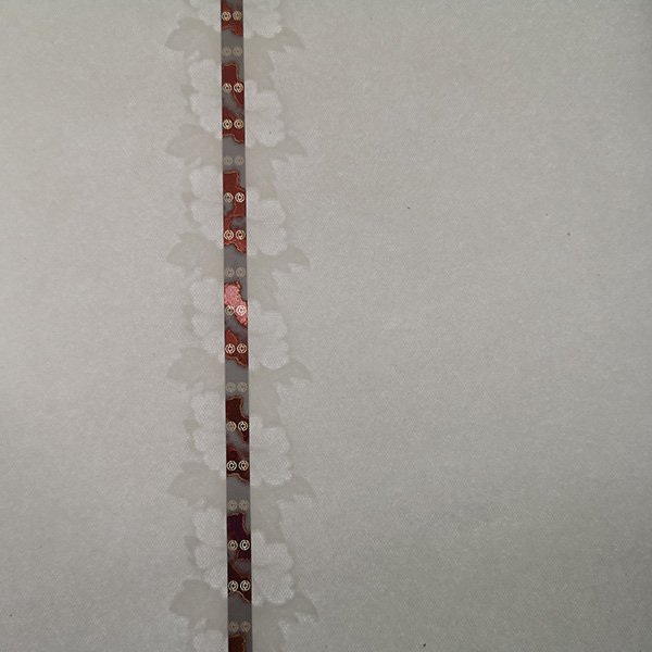 •安(ān)全線(xiàn)纸:指造纸过程中(zhōng)将一条金線(xiàn)或塑胶線(xiàn)置于纸张中(zhōng)间。较早使用(yòng)的是特制金属線(xiàn),现在使用(yòng)聚酯类塑胶線(xiàn)、微型字母安(ān)全線(xiàn)、荧光安(ān)全線(xiàn)、磁性線(xiàn)等。