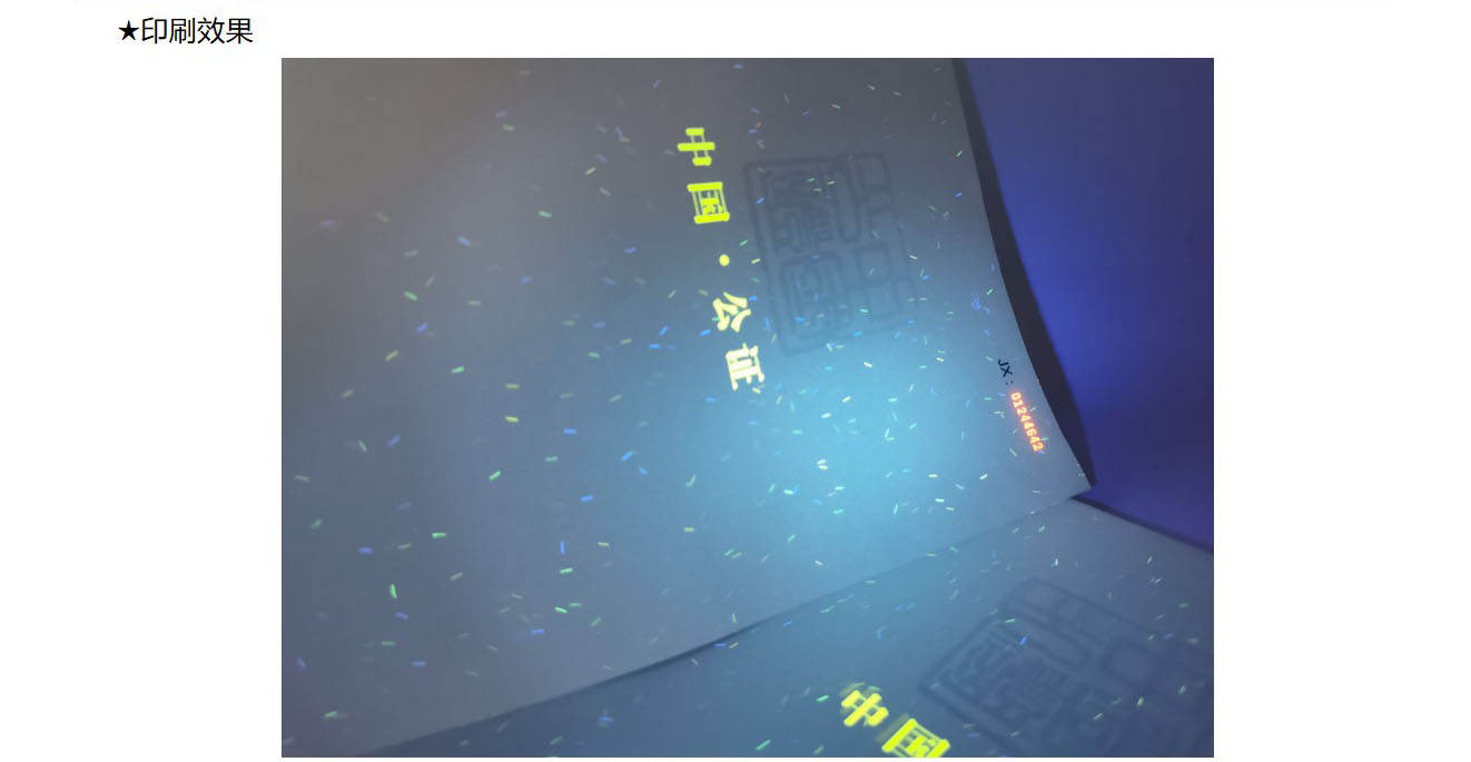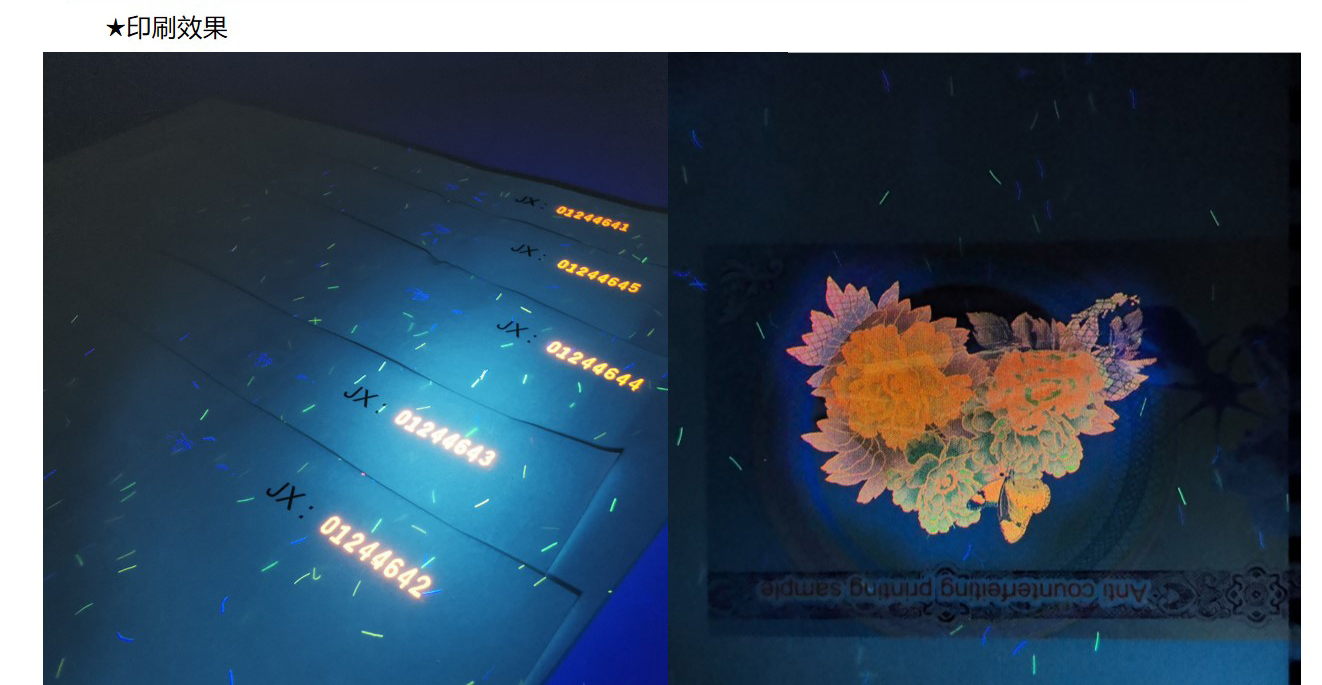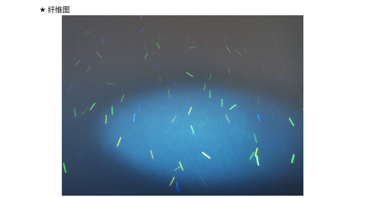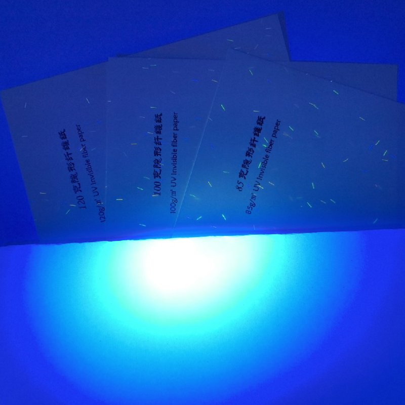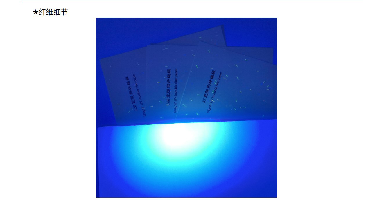 纤维纸:造纸时将红蓝等有(yǒu)色纤维或彩色小(xiǎo)片(点)掺入纸浆内,或在纸张未定型前撒在纸张表面,在紫外線(xiàn)照射下有(yǒu)荧光反射,使纸中(zhōng)带有(yǒu)區(qū)别于纸张本身的有(yǒu)色纤维。掺入纸浆中(zhōng)的红蓝纤维丝和彩点有(yǒu)彩色纤维与无色荧光纤维两种。