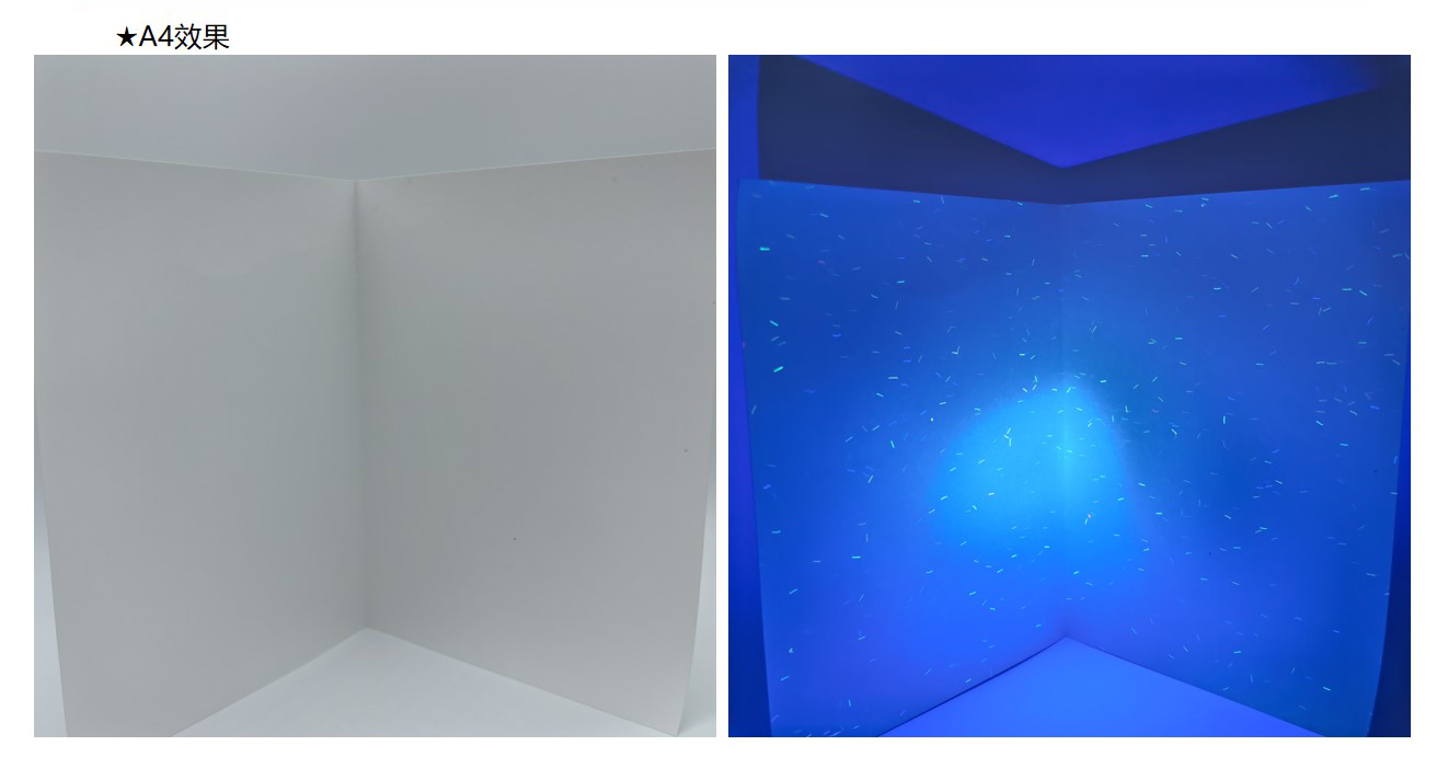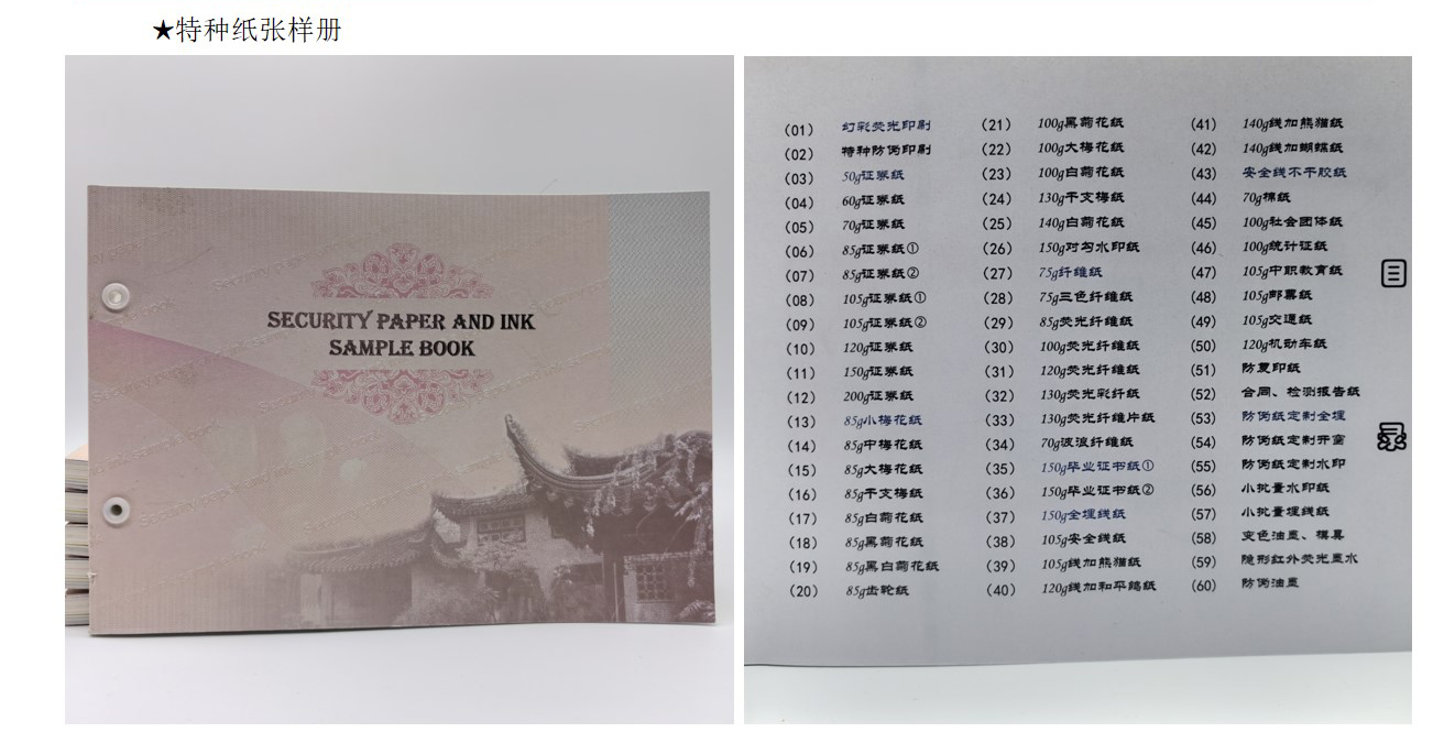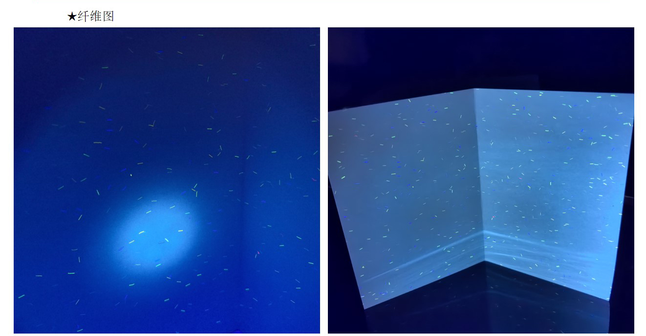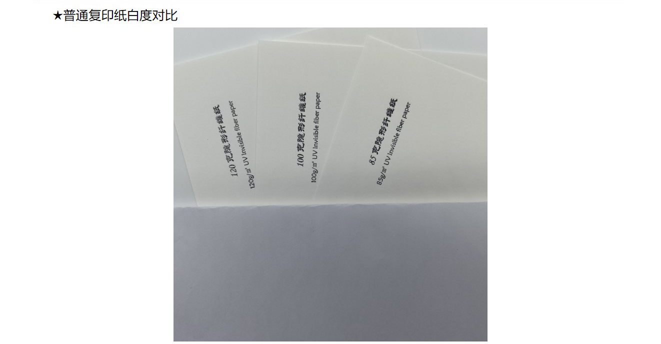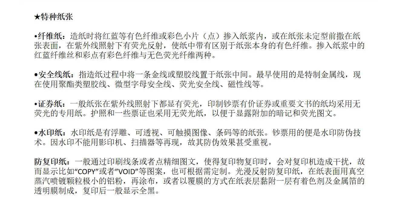 纤维纸:造纸时将红蓝等有(yǒu)色纤维或彩色小(xiǎo)片(点)掺入纸浆内,或在纸张未定型前撒在纸张表面,在紫外線(xiàn)照射下有(yǒu)荧光反射,使纸中(zhōng)带有(yǒu)區(qū)别于纸张本身的有(yǒu)色纤维。掺入纸浆中(zhōng)的红蓝纤维丝和彩点有(yǒu)彩色纤维与无色荧光纤维两种。