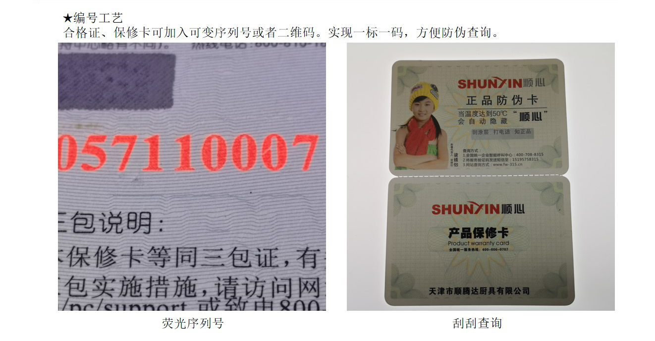 (5)从数码技(jì )术上讲:防伪合格证利用(yòng)计算机技(jì )术、通讯技(jì )术及密码技(jì )术生成无规则、不重复的防伪数码,真正做到一物(wù)一码,安(ān)全保密,防伪性能(néng)**。