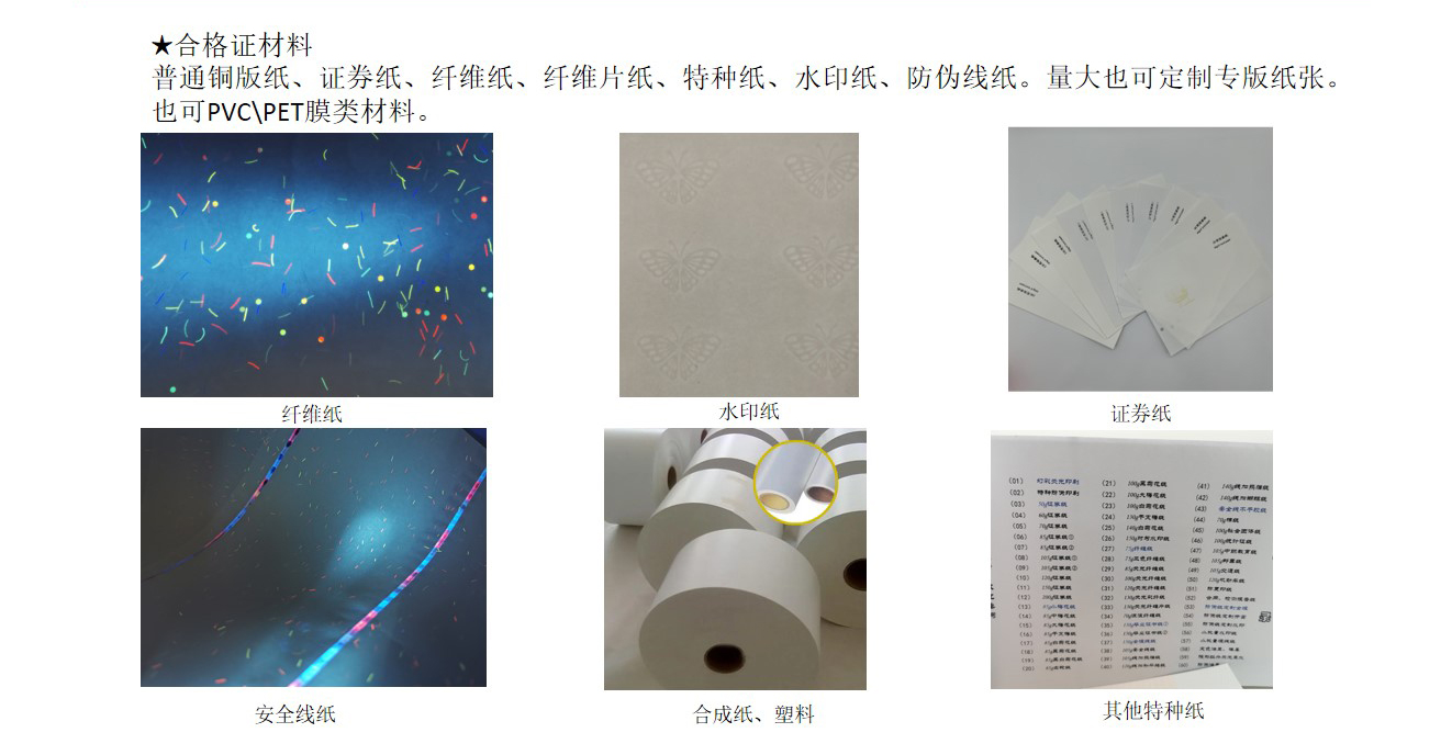 (2)从纸的类型来讲,防伪合格证有(yǒu)以下几种:不干胶纸,铜版纸,特种纸、纤维纸,安(ān)全線(xiàn)纸,水印纸,易碎纸,双层不干胶纸,薄膜材料PET材料等。