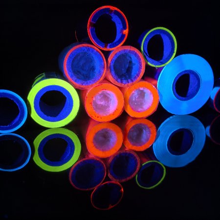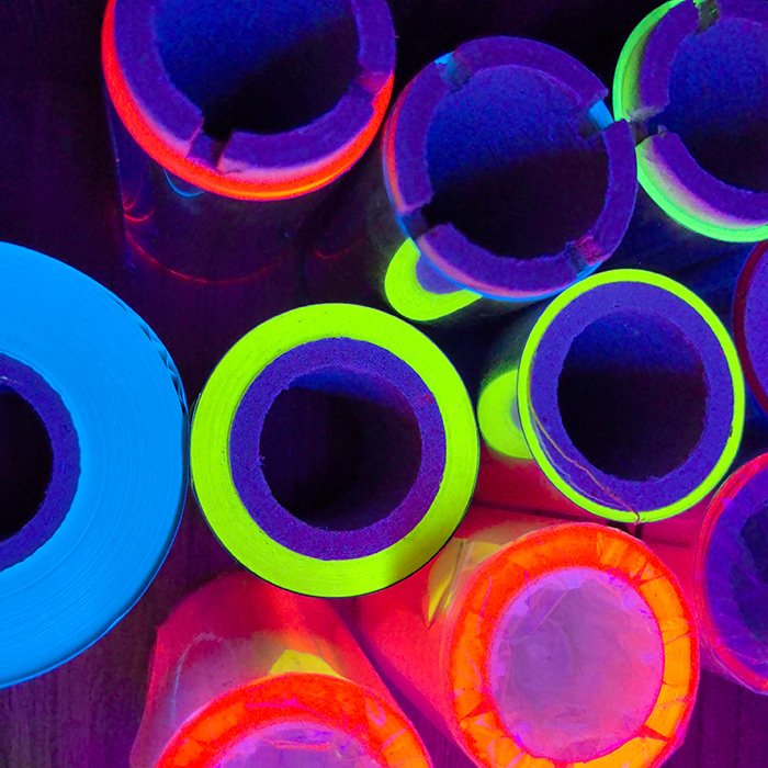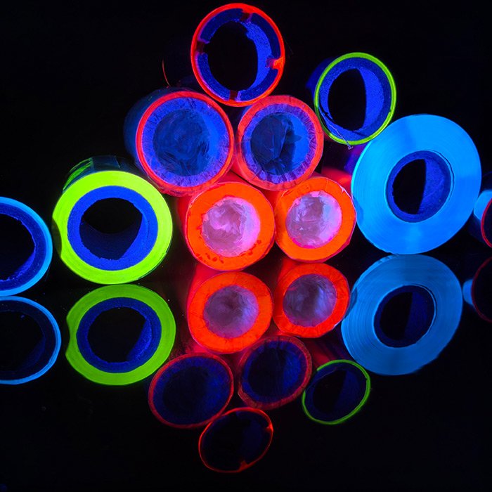 碳带為(wèi)无色透明,打印出的标签信息隐形,肉眼不可(kě)见,在特定波長(cháng)紫外光照射下能(néng)激发出肉眼所见的颜色,如荧光绿。