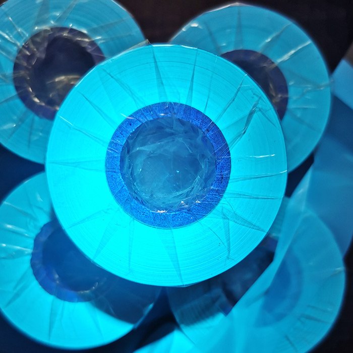 碳带為(wèi)金色或银色,打印出的标签信息為(wèi)電(diàn)化铝亮金或者亮银效果,在特定波長(cháng)紫外光照射下能(néng)激发出肉眼所见的颜色,如荧光绿。